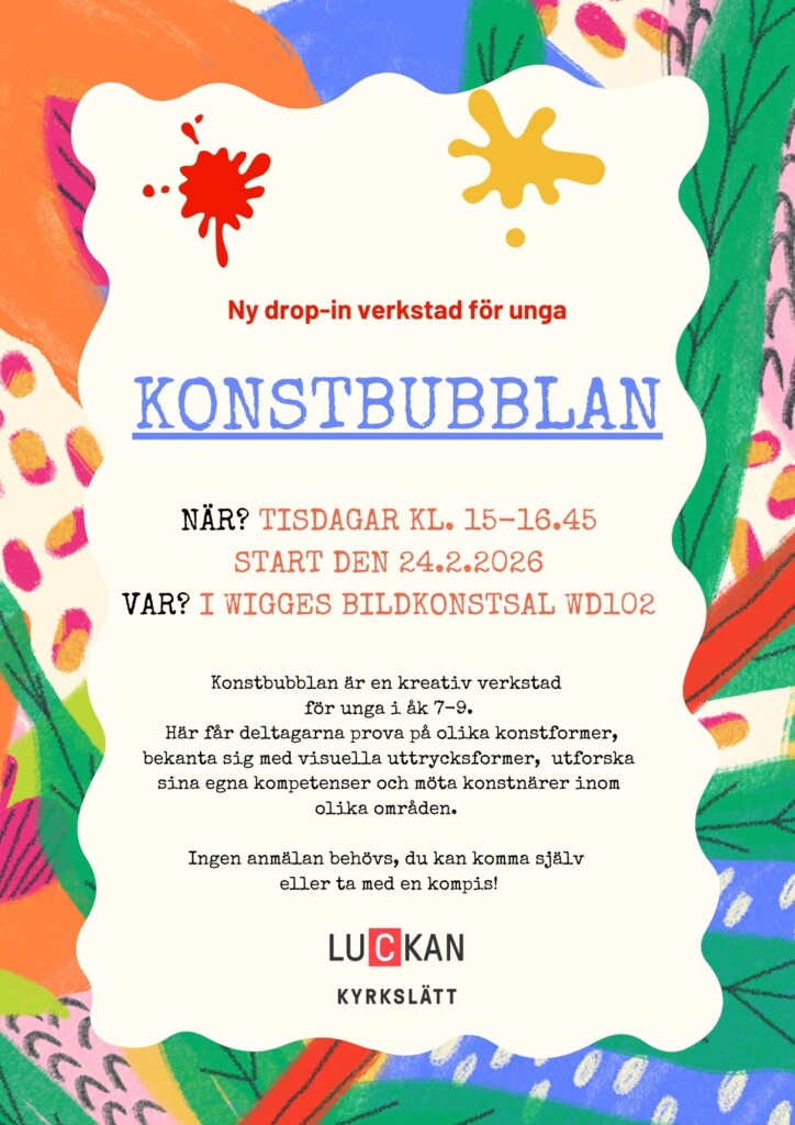 Luckan Kyrkslätt presenterar stolt, för första gången idag, KONSTBUBBLAN för unga i åk 7-9: Ett kostnadsfritt EFTER SKOLAN-HÄNG med betoning på kretivitet och umgänge.Reklam har gått ut till eleverna, men vi hoppas att också vuxna ska sporra unga att idag komma… Fortsätt läsa KONSTBUBBLAN för unga i åk 7-9 - Ny verksamhet i Luckan våren 2026!