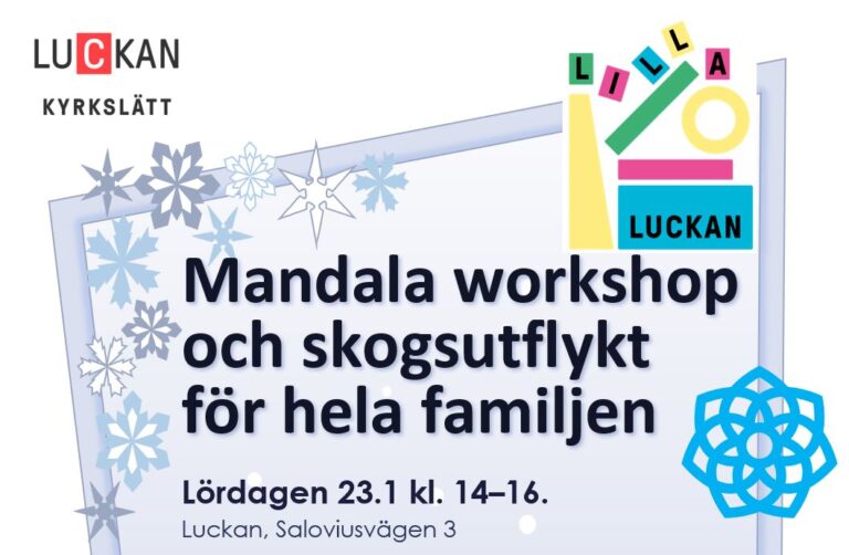 Lördagen 23.1 kl. 14–16. Luckan, Saloviusvägen 3 Vi träffas utanför Luckan kl. 14 och går tillsammans upp på Festberget. Vi samlar material till naturmandalan, tittar på djurspår och utsikten över Kyrkslätt centrum. Utflykten är för hela familjen, och den lämpar sig för alla barn som kan gå själv på skogsstigar. Luckan bjuder på varm saft…