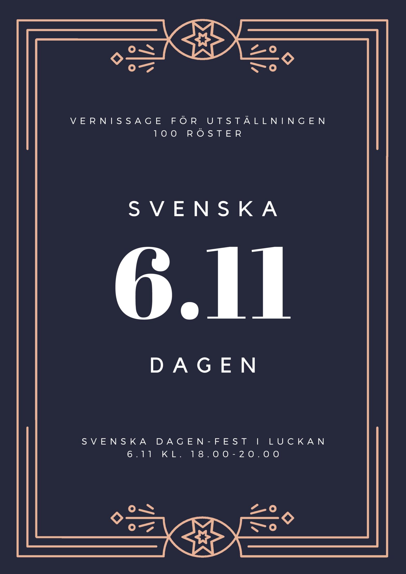 I Luckan betyder Svenska dagen fest och dessutom vernissage för vår egenproducerade utställning ”Hundra röster”. Vi inleder festligheterna klockan 18 med en skål och bekantar oss sedan med utställning. Festtalet hålls av Corinna Tammenmaa och Dollypops uppträder. Självklart avslutar vi festligheterna med att gemensamt sjunga Modersmålets sång.